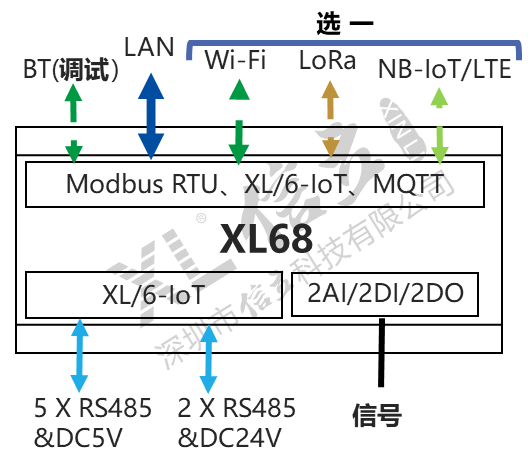 XL68无线环境监测终端,可选LoRa、LTE/NB、Wi-Fi,或Ethernet(以太网)通信方式,支持Modbus RTU、XL/6-IoT、MQTT、API等通信协议;